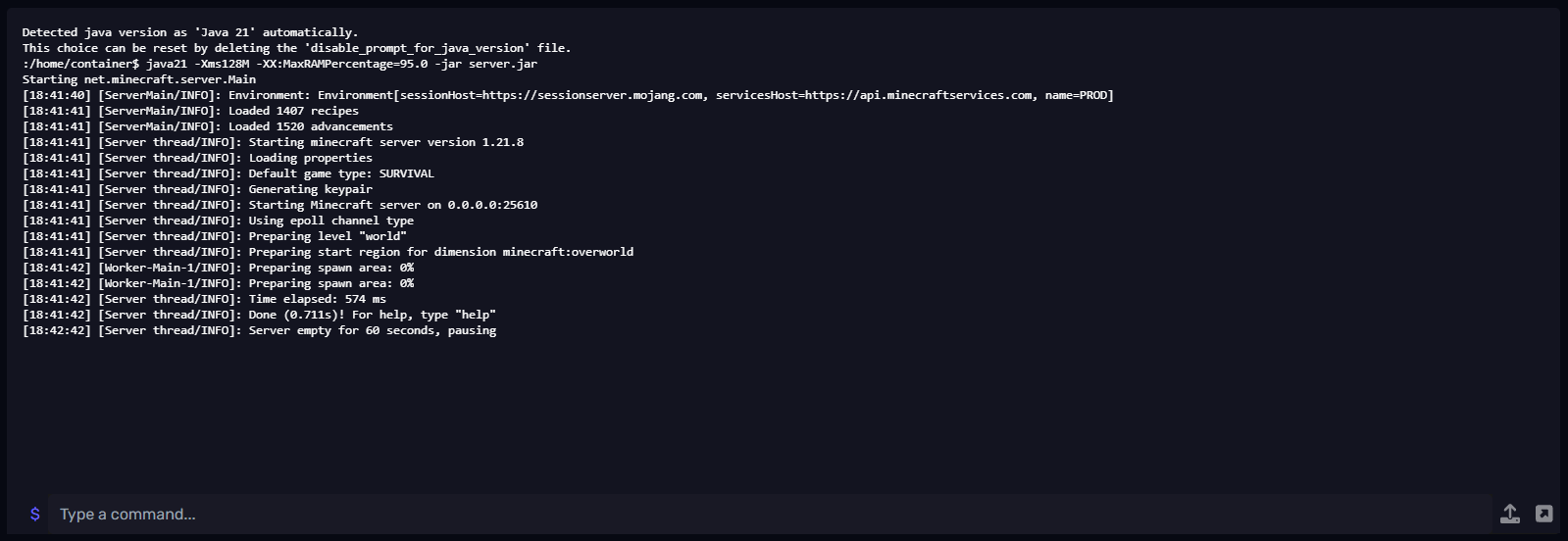 The console provides real-time access to your server:- Live Logs - See server messages in real-time