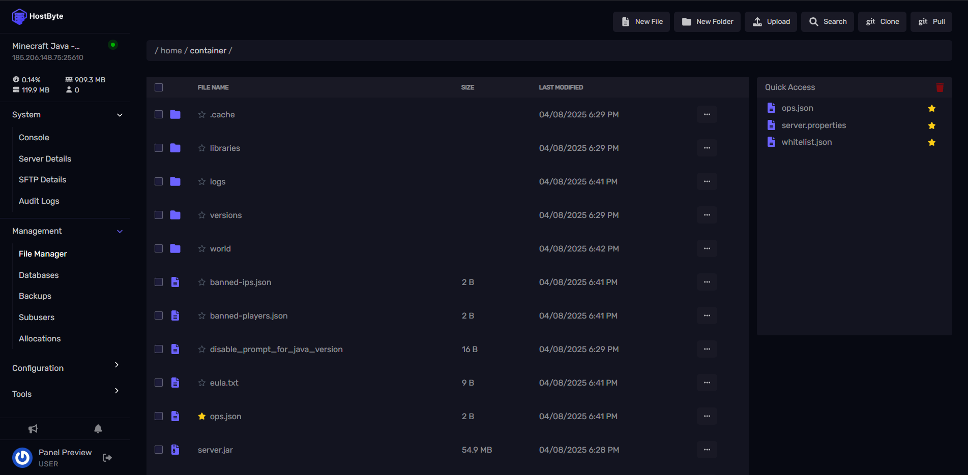 The File Manager provides web-based file management for your server:- File Editing - Edit configuration files directly in browser